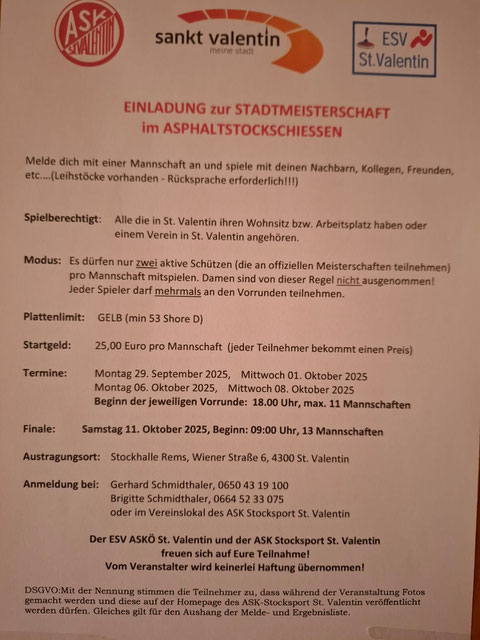 Der ASK Stocksport St. Valentin pflegt diesen Sport durch regelmäßiges Training und unzählige Teilnahmen an Wettkämpfen, sowie durch gesellige Zusammenkünfte. Seit nun mehr als 40 Jahren wird dieser Sport vom ASK Stocksport St. Valentin erfolgreich betrieben.